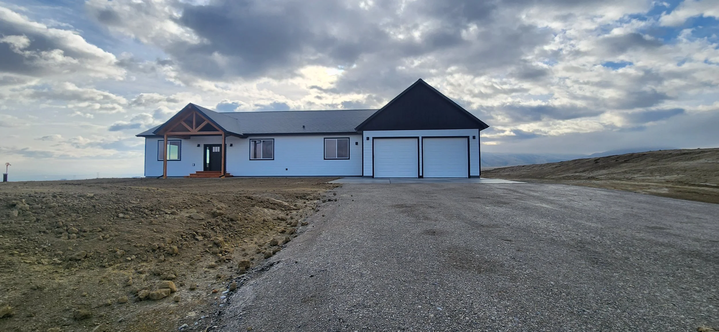 Set against the wide-open Montana plains, this custom-built single-story home delivers clean, modern living with a warm ranch sensibility. The exterior features white lap siding, a dark-trimmed roofline, and a timber-framed covered entry that adds a distinctive, welcoming character. Inside, soaring vaulted ceilings and luxury vinyl plank flooring carry through an open-concept great room and kitchen designed for comfortable everyday living. The kitchen includes rich dark cabinetry, white quartz countertops, stainless steel appliances, and a central island with pendant lighting. A dual-vanity master bath with stone countertops, built-in cabinetry, and a dedicated laundry room round out the thoughtful floor plan. Attached oversized garage provides ample storage for equipment and vehicles. A straightforward, well-crafted home built for the Montana lifestyle.